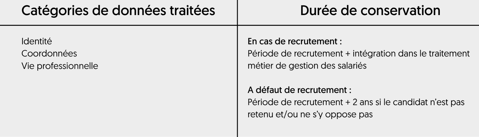 - L’intérêt légitime de la Société : recherche de profils de candidats pour répondre aux besoins de ses activités et clients, suivi des différentes étapes d’un processus de recrutement et identification des besoins.